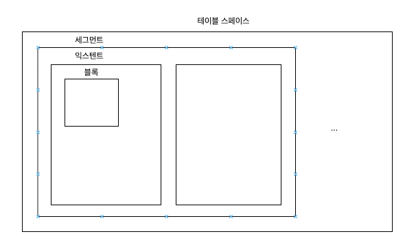테이블 스페이스 - 세그먼트 - 익스텐트 - 블록 - 그안에 로우들이 있다.