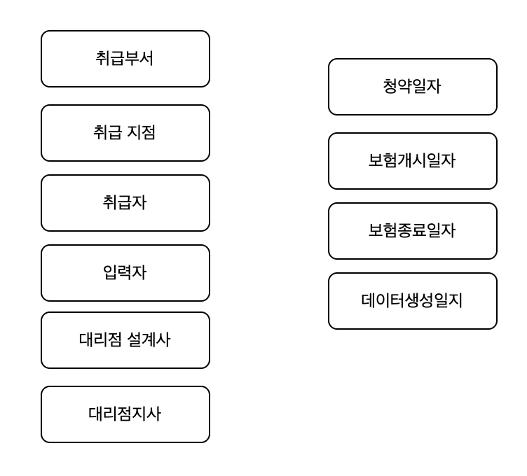X01: 청약일자 + 취급부서 + 취급지점 + 취급자 + 입력자 + 대리점설계사 + 대리점지사