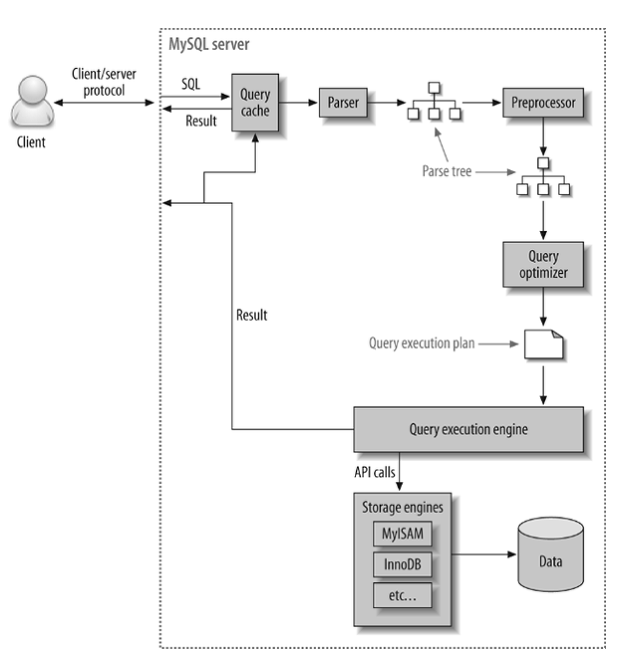 - 클라이언트로부터 접속 및 쿼리 요청을 처리하는 커넥션 핸들러와 sql파서 및 전처리기, 쿼리의 최적화된 실행을 위한 옵티마이저가 중심