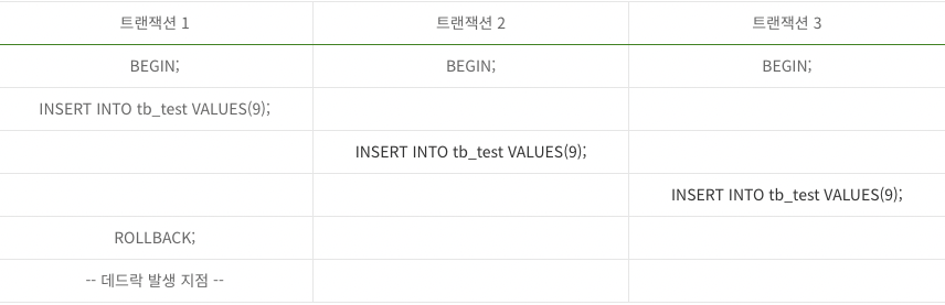 - 트랜잭션 1번이 ROLLBACK을 실행하기 직전까지는 primary key(9)에 대한 exclusive lock을 가지고 있음 ⇒ 트랜잭션 2, 3번은 공유 레코드 잠금을 획득하기 위해 대기