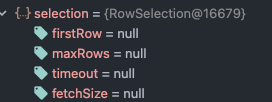 만약 Fetch Join을 사용한다면 RowSelection 객체인 selection을 복사해서 queryParametersToUse 로 사용하게 되는데 이 selection 객체는 우리가 사용하고자 하는 limit 정보를 아래와 같이 전부 null로 가지고 있다.