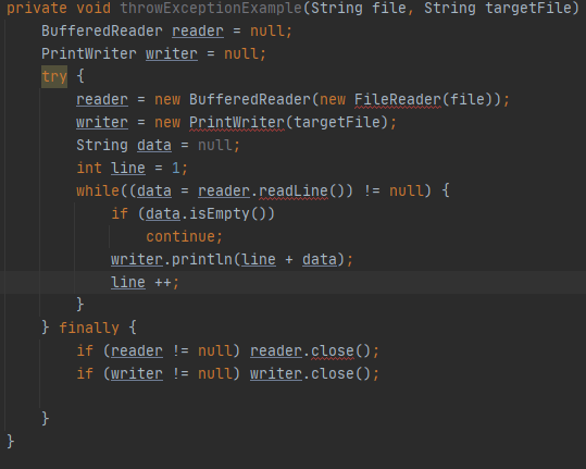 예외 입력 값에 대한 처리 불가능하거나, 참조된 값이 잘못된 경우 등 정상적인 프로그램의 흐름을 어긋나는 것 에러 시스템에 무엇인가 비정상적인 상황이 발생한 경우 Checked Exception / Unchecked Exception checked Exception RuntimeException을 상속하지 않는 클래스 명시적으로 처리해야함 - checked 이 코드에서는 컴파일 시점에 이미 애러발생 아래 코드와 같이 반드시 예외 처리해줘야함 private void throwExceptionExample(String file, String targetFile) throws IOException { BufferedReader reader = null; PrintWriter writer = null; try ..